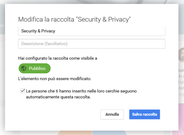 Alcune proprietà della raccolta possono essere modificate cliccando sulla rotellina delle impostazioni sulla testata della raccolta stessa. Il nome è modificabile a piacimento, mentre non è possibile modificare l'ambito di visibilità. Quindi se avevamo creato una raccolta Pubblica, non possiamo ora fare in modo che sia visibile solo ad una cerchia. Però c'è quel'ultima spunta che possiamo modificare a piacimento. Le persone che ti hanno inserito nelle loro cerchie seguono automaticamente questa raccolta permette di decidere se la raccolta deve essere visibile negli stream di tutti i nostri follower o solo di quelli che si sono iscritti esplicitamente alla raccolta.