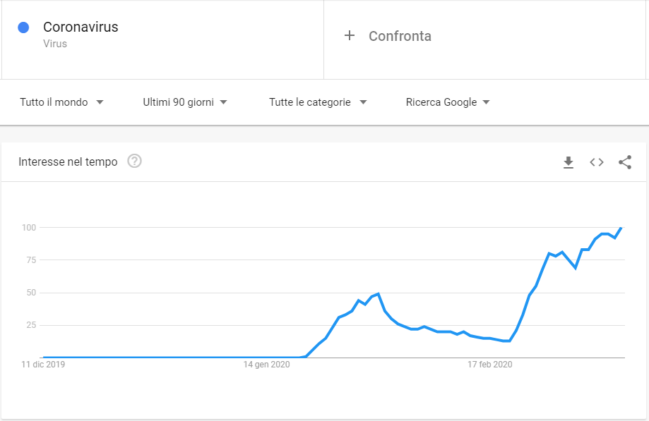 Io mi occupo anche di SEO e di web marketing. Una strategia di web marketing è cercare di cavalcare i temi della rete, sfruttare le discussioni più importanti per aumentare il proprio traffico. Però c'è un limite oltre il quale si diventa speculatori. In questo periodo se noi guardiamo Google Trends il termine coronavirus la fa da padrone. Ovviamente tutte le persone cercano di informarsi sono preoccupati.