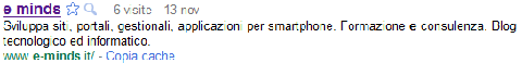 Come si vede nell'esempio ogni risultato è composto da un titolo e da descrizione. La descrizione viene chiamata snippet. Lo snippet è molto importante per l'ottimizzazione sui motori di ricerca. Ha una doppia funzione. Contentere parole chiave che aiutano nella rilevanza del sito sul motore di ricerca. Ed essere sufficientemente descrittivo ed accattivamente per convincere il navigatore a cliccare sul link.