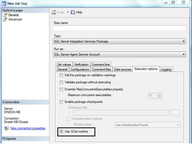 Mentre se eseguiamo il pacchetto SSIS dall'SQL Server Agent come job pianificato, allora dobbiamo andare nelle proprietà dello step dal quale eseguiamo il pacchetto e specificare l'esecuzione a 32 bit.