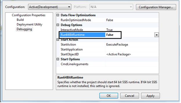 Su Visual Studio, dal quale creiamo i pacchetti SSIS, occorre andare sulle proprietà del progetto, poi su Debugging ed infine mettere a falso Run64BitRuntime.