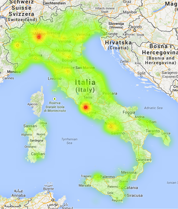 Se sovrapponiamo la mappa della popolazione e quella delle pizzerie noteremo una somiglianza quasi perfetta. Le uniche differenze apprezzabili rispetto alla popolazione è una leggermente maggiore concentrazione su Milano, ed una leggermente minore concentrazione su Napoli, Palermo e Catania.