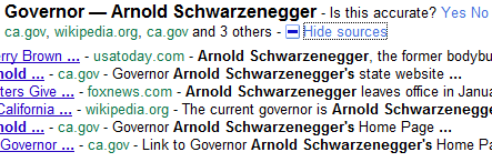 Come si può vedere dall'immagine prima dei classici risultati c'è una cosa nuova. Il motore di ricerca interpreta la nostra richiesta, ed, oltre a presentarci i siti più rilevanti dove si trovano le parole chiave che abbiamo inserito, ci informa anche chi è il governatore della California. E ci dice anche quali sono le fonti.